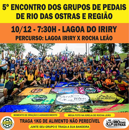 No próximo domingo, dia 10, Rio das Ostras vai sediar mais uma edição do Encontro de Grupos Ciclistas de Rio das Ostras e Região. Aproximadamente 350 ciclistas de toda região são esperados. O ponto de encontro será na Lagoa de Iriry, às 08h30.