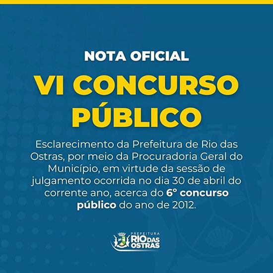A Prefeitura de Rio das Ostras, por meio da Procuradoria Geral do MunicÃpio, em virtude da sessão de julgamento ocorrida no dia 30 de abril do corrente ano, acerca do sexto concurso público do ano de 2012, vem esclarecer o seguinte: