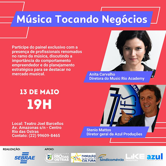 Profissionais do ramo da Música que desejam conquistar um espaço no mercado de forma estratégica e empreendedora têm uma excelente oportunidade. O projeto do Sebrae RJ "Música Tocando Negócios", que promove encontros on-line e presenciais em Rio das Ostras, realiza dia 13, às 19h, no Teatro Joel Barcellos, um painel exclusivo com a presença de profissionais renomados no mundo musical.