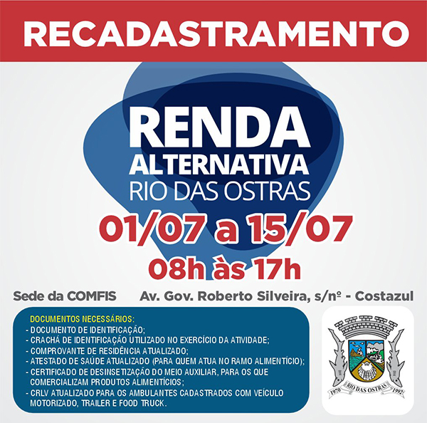 Quem participa do Programa Renda Alternativa de Rio das Ostras deve ficar atento. O recadastramento dos integranres do programa começa na próxima segunda, dia 1º, e vai até 15 de julho. É preciso comparecer à sede da Coordenadoria Geral de Fiscalização e Postura (Comfis) para retirada do boleto referente ao segundo semestre de 2024. A Comfis fica localizada na Avenida Roberto Silveira, s/nº, em Costazul, e funciona de segunda a sexta, das 8h às 17h.