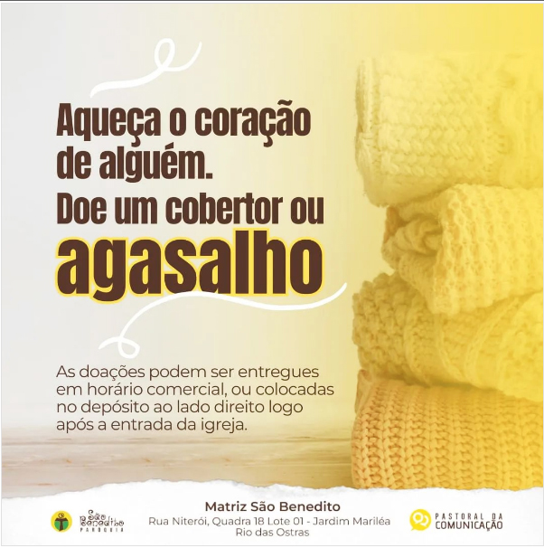 As doações podem ser entregues em horário comercial ou colocadas no depósito ao lado direito logo após a entrada da igreja.