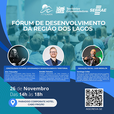 O antropólogo colombiano Santiago Uribe está entre os convidados do Sebrae Rio e da Agência de Desenvolvimento da Região dos Lagos (ADR Lagos) para participar da tarde de debates. Ele vai trazer o caso de Medellín, cidade que deixou de ser a mais violenta do mundo para se tornar referência em inovação social. Já do sul do Brasil virão o pesquisador de futuros Kim Trieweiler e o especialista em gestão baseada em dados Emídio Teixeira para tratar de governança e desenvolvimento territorial.