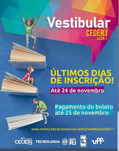 Link para inscrição: www.cecierj.edu.br/consorciocederj/vestibular/2025-1/