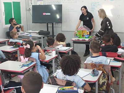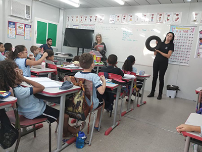 Durante os turnos da manhã e da tarde, uma equipe orientou os alunos sobre a prevenção ao mosquito da dengue, a partir de um trabalho baseado na Educação Popular Transformadora, de forma lúdica e interativa.
