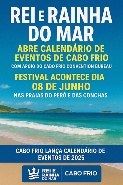 Com novidades em diversos segmentos - cultural, gastronômico e esportivo - a Prefeitura de Cabo Frio lançou o Calendário de Eventos de 2025. Entre os destaques estão o Rei e Rainha do Mar, que volta às praias do Peró e das Conchas no dia 08 de junho; e o tradicional Festival Sabores de Cabo Frio, que chega à 11ª edição em setembro.