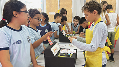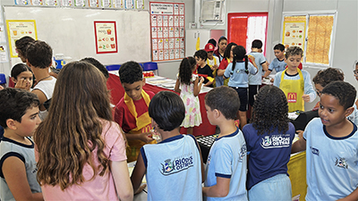 As estações de trabalho foram organizadas com montagem de réplicas de hambúrgueres, de batata frita e preparo de refrigerantes. Para que o atendimento ao público fosse realizado com sucesso, os alunos calcularam o troco, organizaram filas e registraram os pedidos. Com a dinâmica, foram ensinados, na prática, conceitos de sistema monetário, operações matemáticas, cálculo de tempo, grandezas e medidas.