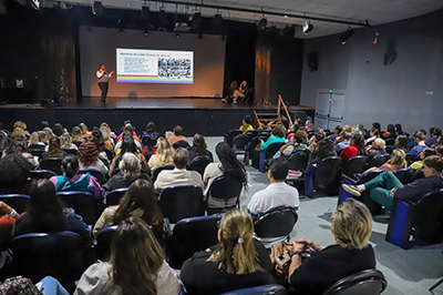 Diante de uma plateia cheia, a subsecretária de Atenção Primária, Rosimeri Azevedo, relacionou a importância do respeito à população LGBT+ com o princÃpio da equidade do SUS. "Nosso papel é cuidar das pessoas com dignidade, respeito e carinho, priorizando o que elas mais necessitam, que é o cuidado à saúde", disse Rosimeri.