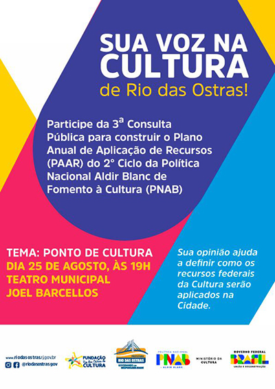 A Prefeitura de Rio das Ostras, por meio da Fundação Rio das Ostras de Cultura (Froc), convida os Pontos de Cultura e a sociedade civil para uma nova consulta pública, agendada para a próxima segunda, dia 25, às 19h. O encontro, que será realizado no Teatro Municipal Joel Barcellos, tem o objetivo de dar continuidade ao debate sobre a elaboração do Plano de Aplicação dos Recursos (PAR), referente ao 2º Ciclo da Política Nacional Aldir Blanc de Fomento à Cultura (PNAB).