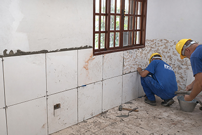 A Escola Municipal João Bento Duarte Neto está recebendo melhorias nos banheiros dos professores, na secretaria e no almoxarifado. Na Escola Municipal Mônica Andrade, é realizada a reparação da cobertura da quadra esportiva.