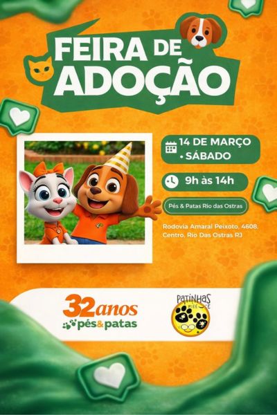 Se você sempre sonhou em dar um lar cheio de amor para um pet, essa é a oportunidade perfeita. Nossa primeira campanha de adoção do ano acontece em um momento especial: no aniversário da loja Pés e Patas de Rio das Ostras. Um dia de celebração, carinho e novas histórias começando.