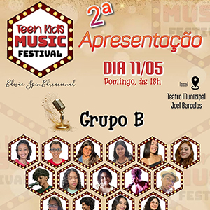 09/05/2025 - O Teatro Municipal Joel Barcellos recebe neste domingo, dia 11, a partir das 18 horas, o Grupo B do Teen Kids Music Festival 2025. O evento, iniciado em Rio das Ostras no ano de 2019, têm descoberto talentos e incentivado a vocação musical de crianças e adolescentes da Cidade. Entre os talentos descobertos pelo Teen Kids estão Sofia Farah e Luís Miguel, que pouco depois participaram do The Voice Kids. Antes de brilhar na atração da TV Globo, Luís Miguel já havia sido finalista do Canta Comigo Teen, da TV Record. Com banda compos...
