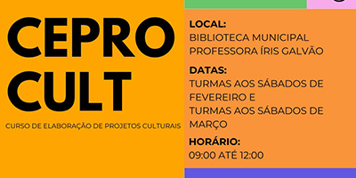 28/01/2025 - A Fundação Rio das Ostras de Cultura informa que as inscrições para o Projeto CeproCult - Curso de Elaboração de Projetos Culturais estão abertas, são gratuitas e devem ser feitas pelo link https://forms.gle/AuYJ34iEfR8ts8wH7. Os interessados deverão preencher o formulário, até o dia 5 de fevereiro, e informar em qual das duas turmas pretendem ingressar. As vagas são limitadas. O Projeto, contemplado no Edital Capacita, da Lei Paulo Gustavo, por meio do Fundo Municipal de Cultura, Fundação Rio das Ostras de Cultura e Prefeitura...