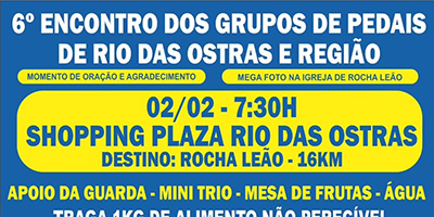 10/01/2025 - 02/02 - 7:30h Shopping Plaza Rio Das Ostras Destino: Rocha Leão - 16km Apoio da guarda - Mini Ttrio. Traga 1kg de alimento não perecível junte seu grupo e traga a sua bandeira...