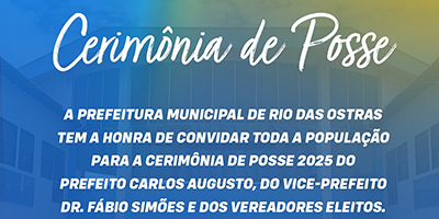 31/12/2024 - Dia 31 Convite Especial à População de Rio das Ostras A Prefeitura Municipal de Rio das Ostras tem a alegria de convidar todos os cidadãos para a Cerimônia de Posse 2025 do prefeito Carlos Augusto, do vice-prefeito Dr. Fábio Simões e dos vereadores eleitos. 🗓 Data: 1º de janeiro de 2025 ⏰ Horário: 17h 📍 Local: Sede da Prefeitura Municipal Endereço: Rua Campo do Albacora, 75 - Loteamento Atlântica Venha fazer parte deste momento histórico e celebrar o início de um novo tempo para Rio das Ostras. A sua pr...
