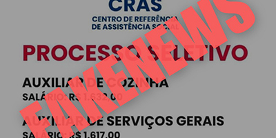 02/08/2024 - A Prefeitura de Rio das Ostras comunica à população sobre uma fake news (notícia falsa) que está circulando por meio de aplicativos de mensagens e redes sociais. Um banner está promovendo um suposto processo seletivo de empregos no Centro de Referência de Assistência Social (CRAS). Salientamos que esta arte não menciona que o CRAS é de Rio das Ostras, o que já indica uma possível tentativa de golpe. Reiteramos que o CRAS é uma unidade de Assistência Social, que presta serviços de proteção e atendimento às famílias e indivÃ...