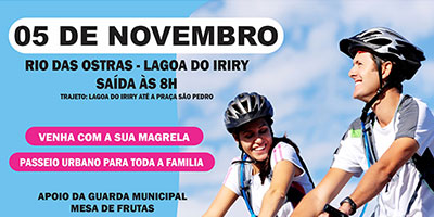03/11/2023 - Com o objetivo de promover mais saúde e um dia de descontração entre as gerações, Rio das Ostras recebe mais uma edição do Pedal da Família. O ponto de encontro será na Lagoa de Iriry, e a saída está prevista para às 8h. Ciclistas de todas as idades estão convidados para participar do evento. O trajeto será acompanhado por um mini-trio elétrico, que acompanhará todos os atletas no percurso até a Praça São Pedro. Na chegada, uma mesa de frutas também estará disponível para todos que participarem do evento. O Pedal da ...