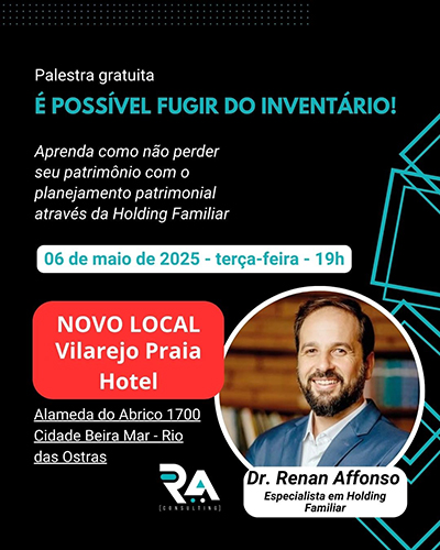 Quero te convidar para uma palestra gratuita no dia 6 de maio, às 19h, com o advogado Renan Affonso, especialista em Planejamento Patrimonial e Holding Familiar, que vai explicar como organizar seus bens de forma segura e inteligente!