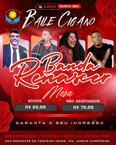 No dia 18 de junho (quarta-feira), às 20h, o Grupo Renascer da Terceira Idade convida você para o tradicional Baile Cigano, com apresentação especial da animadíssima Banda Renascer!