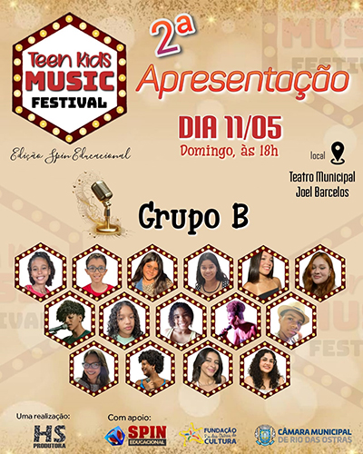 O Teatro Municipal Joel Barcellos recebe neste domingo, dia 11, a partir das 18 horas, o Grupo B do Teen Kids Music Festival 2025. O evento, iniciado em Rio das Ostras no ano de 2019, têm descoberto talentos e incentivado a vocação musical de crianças e adolescentes da Cidade.