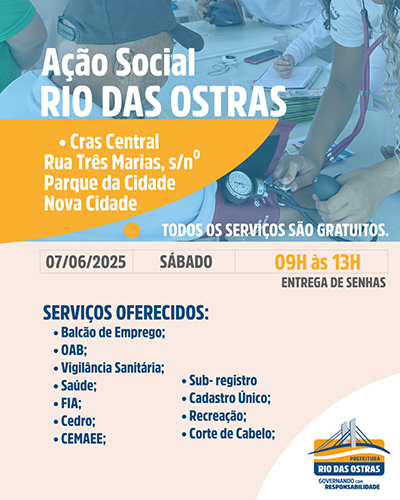 A Ação Social itinerante, realizada pela Prefeitura de Rio das Ostras, por meio da Secretaria de Assistência Social, chega ao Centro de Referência de Assistência Social – CRAS Central, na Rua Três Marias, s/nº – Parque da Cidade, no próximo sábado, dia 7.