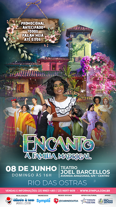 Como comprar: Sympla (PIX, boleto ou cartão) pelo link https://www.sympla.com.br/evento/encanto-a-familia-madrigal-em-rio-das-ostras/2959994