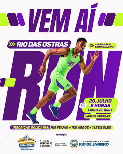 Vem aí a Rio das Ostras Run. A Prefeitura de Rio das Ostras, em parceria com o Governo do Estado do Rio de Janeiro, por meio da Lei de Incentivo ao Esporte, promove no dia 20 de julho, a partir das 8h, a Corrida Rio das Ostras Run. O evento esportivo será realizado na Lagoa de Iriry, um dos cartões-postais mais visitados do Município, e promete atrair corredores e caminhantes de toda a Região.