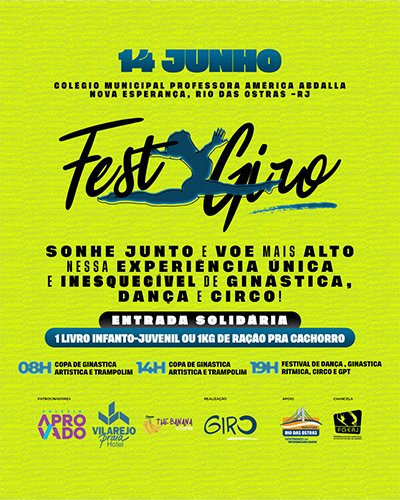 Organizado pela Escola de Ginástica Artística GIRO, com apoio da Prefeitura de Rio das Ostras, por meio da Secretaria de Educação, Esporte e Lazer, o FestGIRO tem como objetivo promover a prática de ginástica, circo e outras atividades artísticas, além de estimular o desenvolvimento físico e mental dos participantes, celebrando o movimento, a criatividade e a dedicação de alunos e professores de Rio das Ostras e Região.