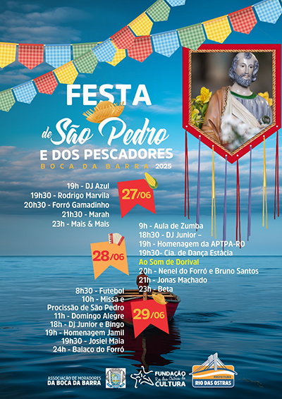 Organizada pela Associação de Moradores de Boca da Barra, em parceria com a Prefeitura e a Fundação Rio das Ostras de Cultura, a Festa de São Pedro terá inÃcio na sexta, 27, à s 19h. A abertura fica por conta do DJ Azul, preparando o clima para a noite. O primeiro show será de Rodrigo Marvila, que tem uma trajetória musical de mais de 20 anos. Em seguida, o Forró Gamadinho celebra os grandes mestres do forró pé de serra. A energia contagiante de Marah, artista de axé com hits autorais, vem logo depois. Para encerrar, o grupo Mais & Mais apresenta sucessos do pagode.