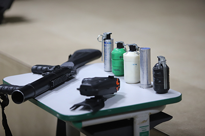 CURSO - Na capacitação, os agentes receberam conteúdo programático sobre o conceito não letal, classificação das tecnologias não letais, legislação nacional e internacional de uso destes equipamentos (lançadores, espargidores de pimenta, granadas lacrimogênea e de pimenta, granadas explosivas, munições táticas e outros), o uso proporcional e seletivo da força, os agentes quÃmicos e suas definições, os efeitos no organismo, como é feita a descontaminação e os primeiros socorros, manuseio destes equipamentos, cuidados, transporte, como é feito o emprego tático, as práticas em ambiente de controle de multidões e outros. Também foram estudadas as caracterÃsticas, funcionamento e contraindicações do uso do dispositivo elétrico incapacitante (spark), disparos individuais e oficinas de vivenciamento.