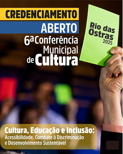 O credenciamento on-line para a 6ª Conferência Municipal de Cultura de Rio das Ostras prossegue até 31 de julho, às 17h59, pelo link https://editais.fundacaoriodasostrasdecultura.rj.gov.br/. Para assegurar uma programação rica em atrações artísticas, palestras e debates construtivos entre diferentes setores e a sociedade, a Fundação de Cultura e a Comissão Organizadora têm trabalhado intensamente.