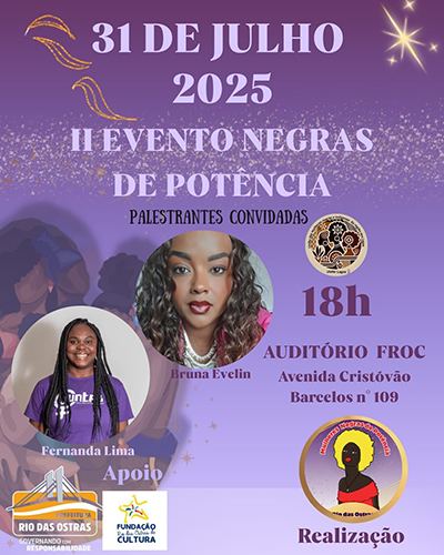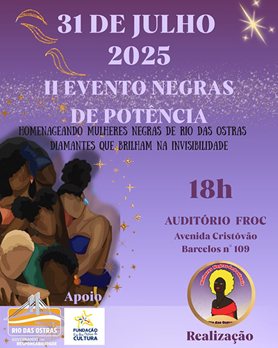 Rio das Ostras recebe a segunda edição do "Negras de Potência" nesta quinta-feira, 31 de julho, às 18h, no auditório da Fundação Rio das Ostras de Cultura (Froc). O evento, que celebra o Mês da Mulher Negra Latino-Americana e Caribenha, é uma realização do Coletivo Mulheres Negras de Potência, em parceria com o setor de Matrizes Africanas do Conselho Municipal de Cultura e a Secretaria de Assistência Social, e o apoio da Froc.