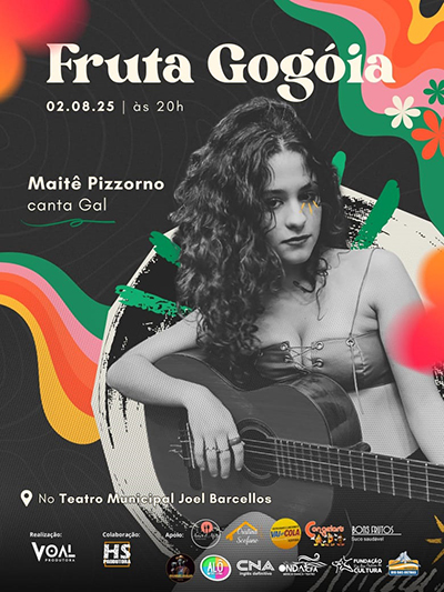 Uma celebração à arte tropicalista vivida por uma das vozes mais marcantes da Música Popular Brasileira. Neste sábado, dia 2 de agosto, à s 20h, a jovem cantora Maitê Pizzorno, de 18 anos, sobe ao palco do Teatro Municipal Joel Barcellos, em Rio das Ostras, para interpretar a inesquecÃvel Gal Costa no espetáculo "Fruta Gogóia". Com forte inspiração na estética dos anos 1970, o show mergulha no universo musical da cantora baiana, destacando sua potência cênica e interpretativa.