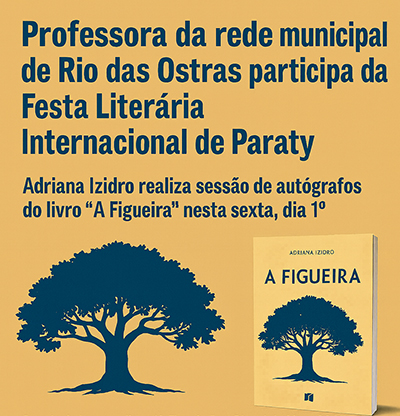 Depois de lançar o livro "A Figueira" na Bienal do Livro 2025 em junho, a professora da rede municipal de Educação, Adriana Izidro, vai participar nesta sexta-feira, dia 1º de agosto, a partir das 18h, de uma sessão de autógrafos na Flip - Festa Literária Internacional de Paraty, considerada festa literária mais badalada do paÃs. O encontro acontece na "Casa, Escreva Garota!", no estande da Com.tato, na Travessa Gravatá, 56 c/d.