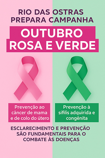 A Prefeitura de Rio das Ostras, por meio da Secretaria de Saúde, prepara o lançamento da campanha "Outubro Rosa e Verde", que tem como objetivo a prevenção ao câncer de mama e de colo uterino e também da sÃfilis adquirida e congênita. Com a iniciativa, o MunicÃpio une as mobilizações em torno do Outubro Rosa e do Outubro Verde, que envolvem ações de prevenção e promoção da saúde.