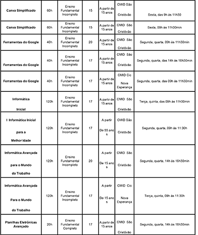 Entre os cursos oferecidos estão Canva Simplificado, Informática Inicial para a Melhor Idade, Informática Inicial, Ferramentas do Google, Informática Avançada para o Mundo do Trabalho e Excel (Planilhas Eletrônicas - Avançado). As aulas acontecerão nos turnos da manhã e da tarde, nos polos do Centro Municipal de Inclusão Digital (CMID), localizados em São Cristóvão e Nova Esperança.