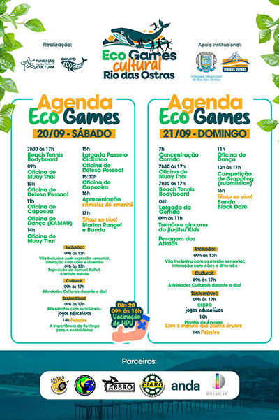 Com uma programação aberta a todas as idades, o Eco Games Cultural inclui uma variedade de atividades esportivas, como competições de bodyboard, corrida de rua, jiu-jitsu, beach tennis e um passeio ciclístico. A Vila Inclusiva e as áreas Cultural e Sustentável reúnem atividades nos dois dias do evento. No sábado, às 16h, haverá apresentação dos Ritmistas do Amanhã e, em seguida, show de Marlon Rangel e Banda; no domingo, às 16h, quem sobe ao palco é a Banda Black Doze.