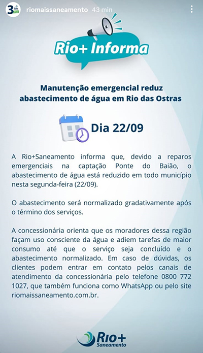 Rio+ Informa Manutenção emergencial reduz abastecimento de água em Rio das Ostras Dia 22/09