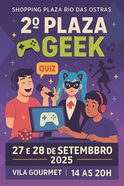 O universo geek vai invadir novamente o Shopping Plaza Rio das Ostras, no Bairro Harmonia! Nos dias 27 e 28 de setembro, a Vila Gourmet será palco da segunda edição do Plaza Geek, reunindo fãs de todas as idades em uma verdadeira celebração da cultura pop, da tecnologia e da diversão.