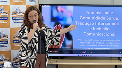 As palestras foram ministradas por Angeline Kelyy da Costa Guimarães, Catia Cilene Barreto de Jesus e Rhebeca Victor de Araújo – do Departamento de Ensino Superior do Instituto Nacional de Educação de Surdos (DESU-INES), além de Cristina Regina Dantas, Mestre em Cognição e Linguagem pela Universidade Estadual do Norte Fluminense (Uenf).