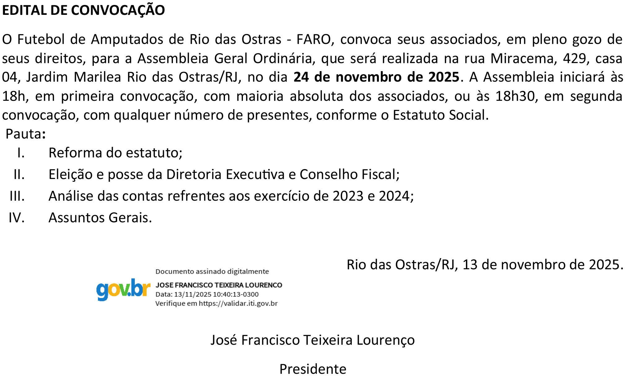 seus direitos, para a Assembleia Geral Ordinária, que será realizada na rua Miracema, 429, casa 04, Jardim Marilea Rio das Ostras/RJ, no dia 24 de novembro de 2025. A Assembleia iniciará às 18h, em primeira convocação, com maioria absoluta dos associados, ou às 18h30, em segunda convocação, com qualquer número de presentes, conforme o Estatuto Social.