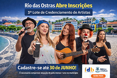 Começou o terceiro lote de credenciamento para artistas, produtores e profissionais do setor cultural de Rio das Ostras. O cadastro permite a contratação para eventos públicos promovidos ou apoiados pelo Poder Público Municipal (Fundação Rio das Ostras de Cultura e Prefeitura). As inscrições, que são gratuitas, seguem abertas até 30 de junho pelo Porta da Froc (www.fundacaoriodasostrasdecultura.rj.gov.br).