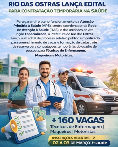Para garantir o pleno funcionamento da Atenção Primária à Saúde (APS), centro coordenador da Rede de Atenção à Saúde (RAS), e das unidades de Atenção Especializada, a Prefeitura de Rio das Ostras lançou um edital de processo seletivo público simplificado para preenchimento de vagas e formação de cadastro de reserva para contratações temporárias do quadro de pessoal para Técnicos de Enfermagem, Maqueiros e Motoristas.