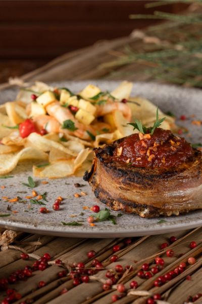 Medalhão de tainha com geleia de aroreira, ceviche de camarão da lagoa com banana-da-terra e pétalas de mandioca.
