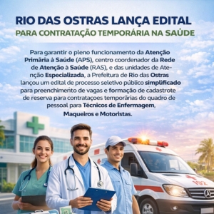 26/02/2026 - Para garantir o pleno funcionamento da Atenção Primária à Saúde (APS), centro coordenador da Rede de Atenção à Saúde (RAS), e das unidades de Atenção Especializada, a Prefeitura de Rio das Ostras lançou um edital de processo seletivo público simplificado para preenchimento de vagas e formação de cadastro de reserva para contratações temporárias do quadro de pessoal para Técnicos de Enfermagem, Maqueiros e Motoristas. As inscrições podem ser feitas das 8h do dia 02 de março às 23h59 do dia 03 do mesmo mês, por meio d...