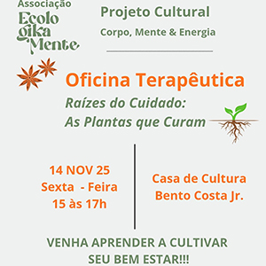 12/11/2025 - A Casa de Cultura Dr. Bento Costa Júnior vai sediar o Projeto Cultural Corpo, Mente e Energia. A iniciativa consiste em uma série de encontros independentes, durante seis meses, que vão tratar de diferentes temas, sempre voltados para promoção da saúde de maneira holística e acessível. O primeiro é a Oficina Terapêutica "Raízes do Cuidado: as plantas que curam", que acontece nesta sexta-feira, 14 de novembro. Realizados sempre às sextas-feiras, das 15h às 17h, os encontros vão ensinar práticas de autocuidado e autoconhecimento...