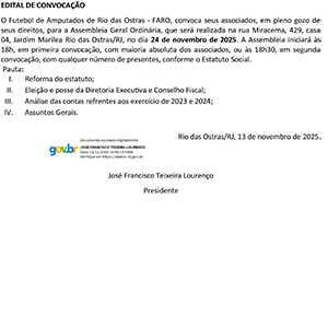 15/11/2025 - O Futebol de Amputados de Rio das Ostras - FARO, convoca seus associados, em pleno gozo de seus direitos, para a Assembleia Geral Ordinária, que será realizada na rua Miracema, 429, casa 04, Jardim Marilea Rio das Ostras/RJ, no dia 24 de novembro de 2025. A Assembleia iniciará às 18h, em primeira convocação, com maioria absoluta dos associados, ou às 18h30, em segunda convocação, com qualquer número de presentes, conforme o Estatuto Social. Pauta: I. Reforma do estatuto; II. Eleição e posse da Diretoria Executiva e Conselho Fi...