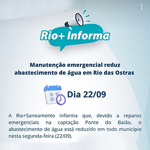 22/09/2025 - A Rio+Saneamento informa que, devido a reparos emergenciais na captação Ponte do Baião, o abastecimento de água está reduzido em todo município nesta segunda-feira (22/09). O abastecimento será normalizado gradativamente após o término dos serviços. A concessionária orienta que os moradores dessa região façam uso consciente da água e adiem tarefas de maior consumo até que o serviço seja concluído e o abastecimento normalizado. Em caso de dúvidas, os clientes podem entrar em contato pelos canais de atendimento da concessi...