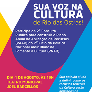 29/07/2025 - Rio das Ostras quer escutar artistas e fazedores de cultura locais para assegurar que os recursos da Política Nacional Aldir Blanc de Fomento à Cultura (PNAB) continuem a ser aplicados de forma democrática, como determina a Lei 14903/2024. Com esse objetivo, o Município promove na próxima segunda, 4 de agosto, às 19 horas, no Teatro Municipal Joel Barcellos, a Consulta Pública (Oitiva) do Plano Anual de Aplicação de Recursos (PAAR) do 2º Ciclo da PNAB. Realizada pela Fundação Rio das Ostras de Cultura e pelo Fundo Municipal de Cu...